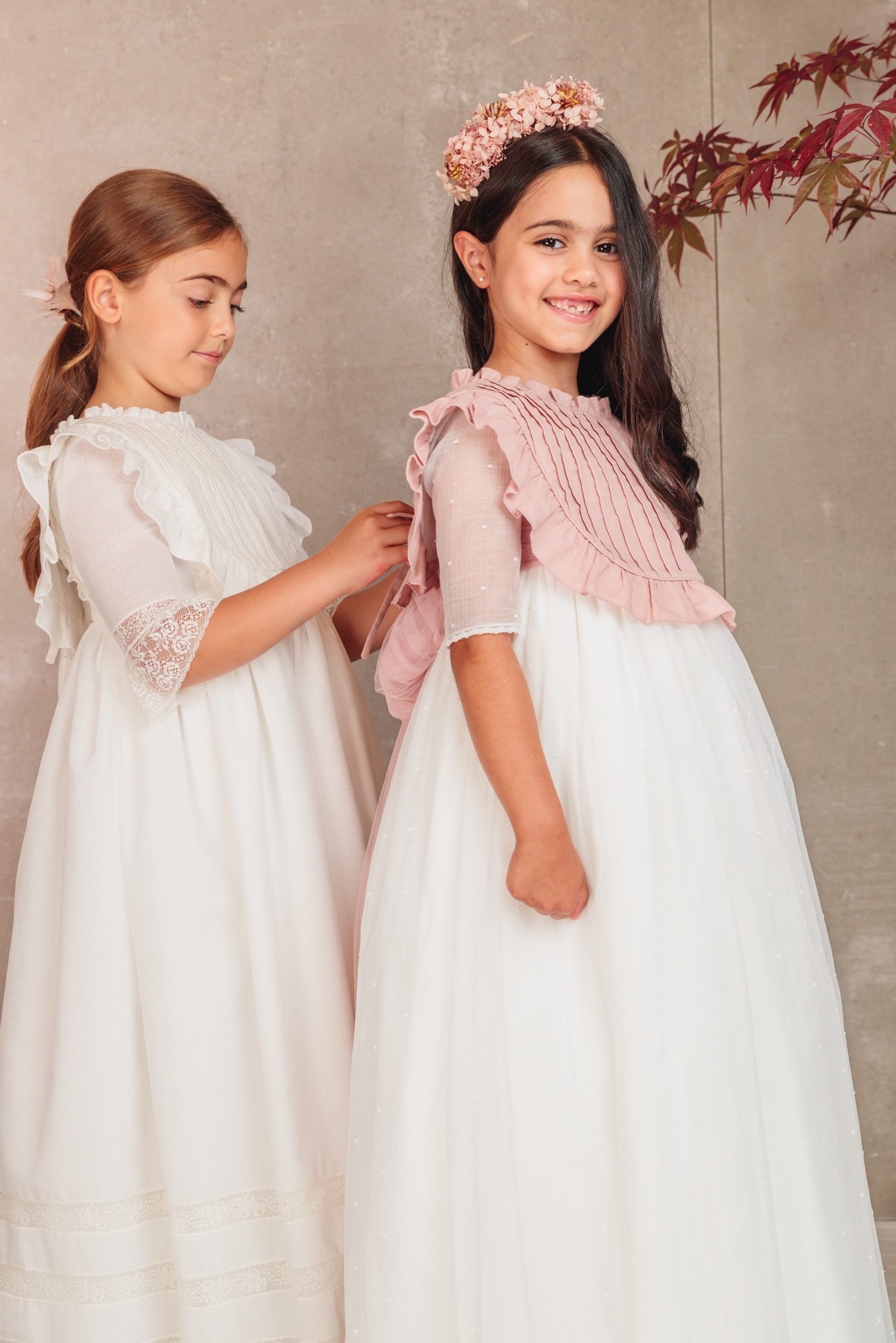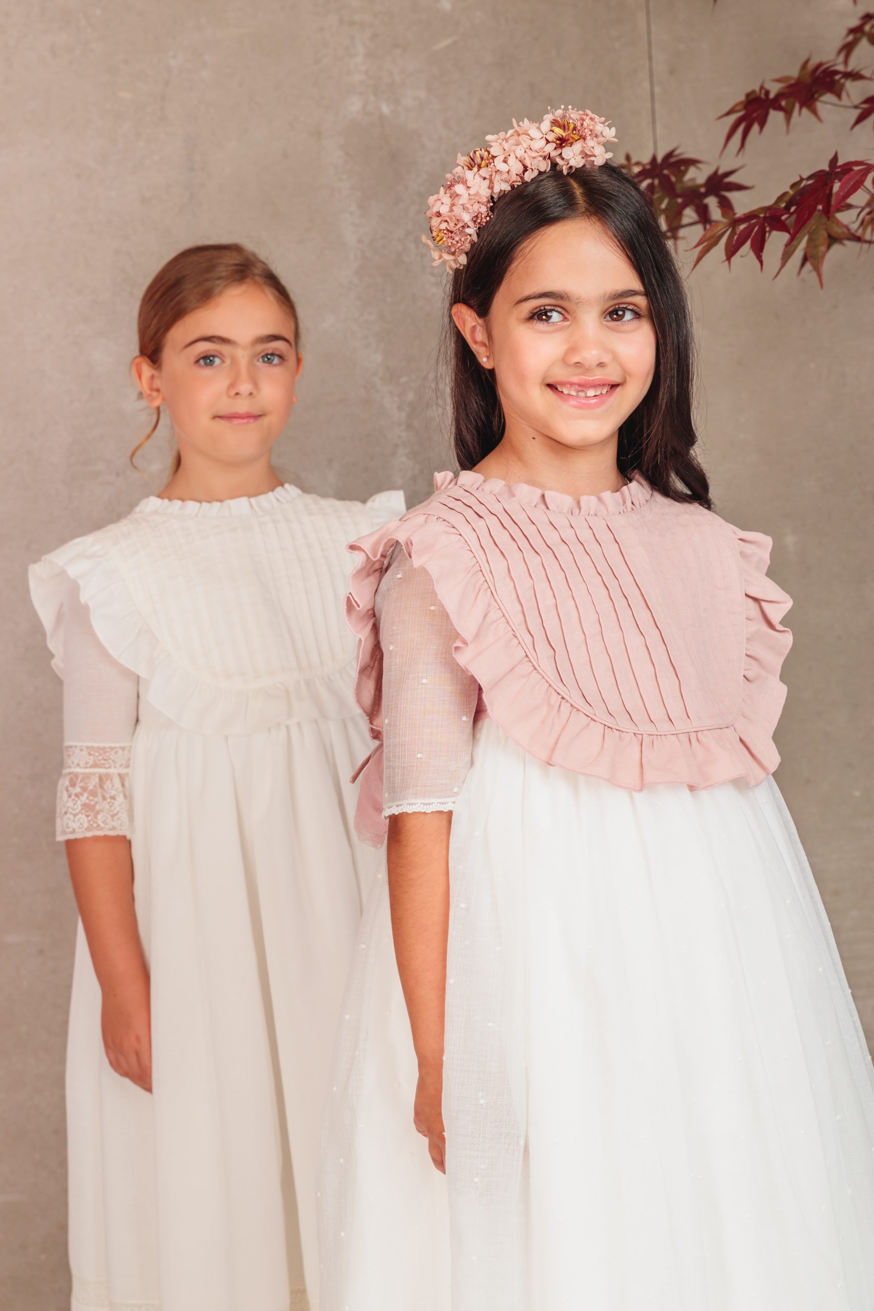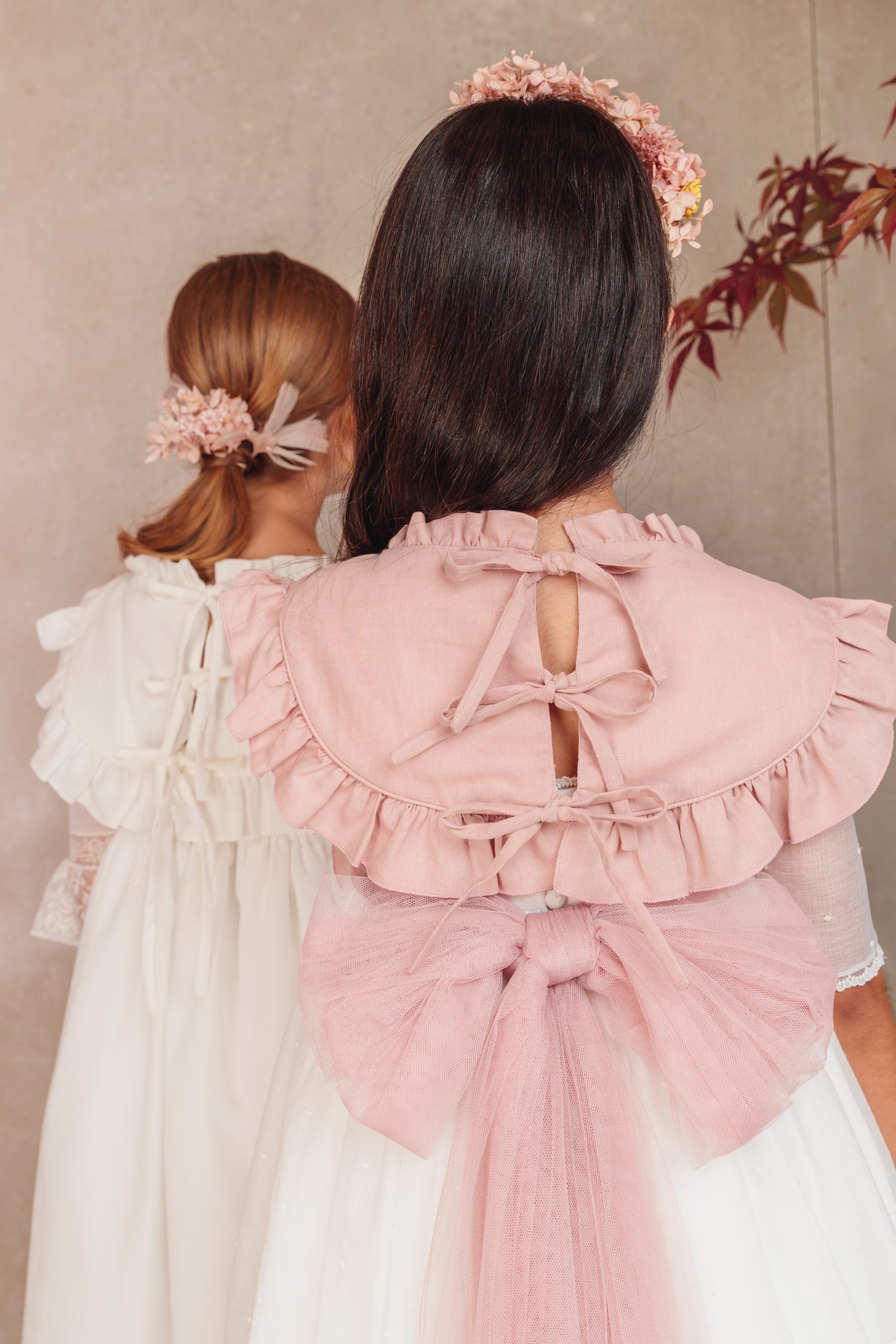 Esta delicada capa de comunión con lino y lorzas en el cuerpo delantero es el complemento perfecto para un look inolvidable.