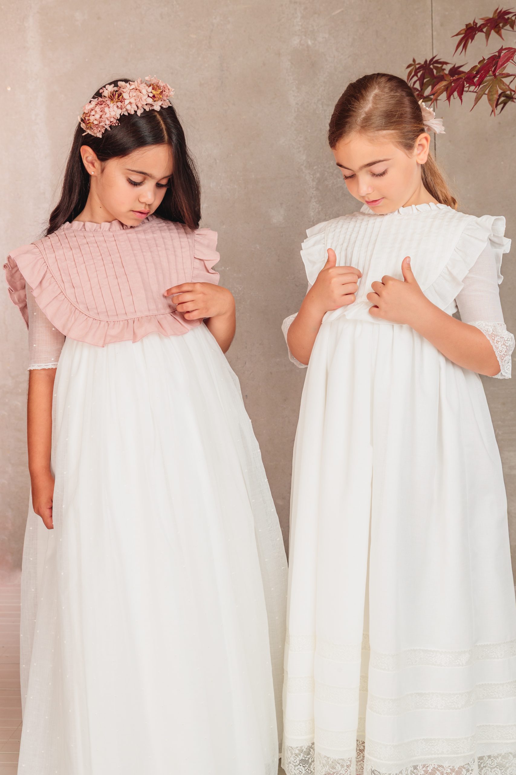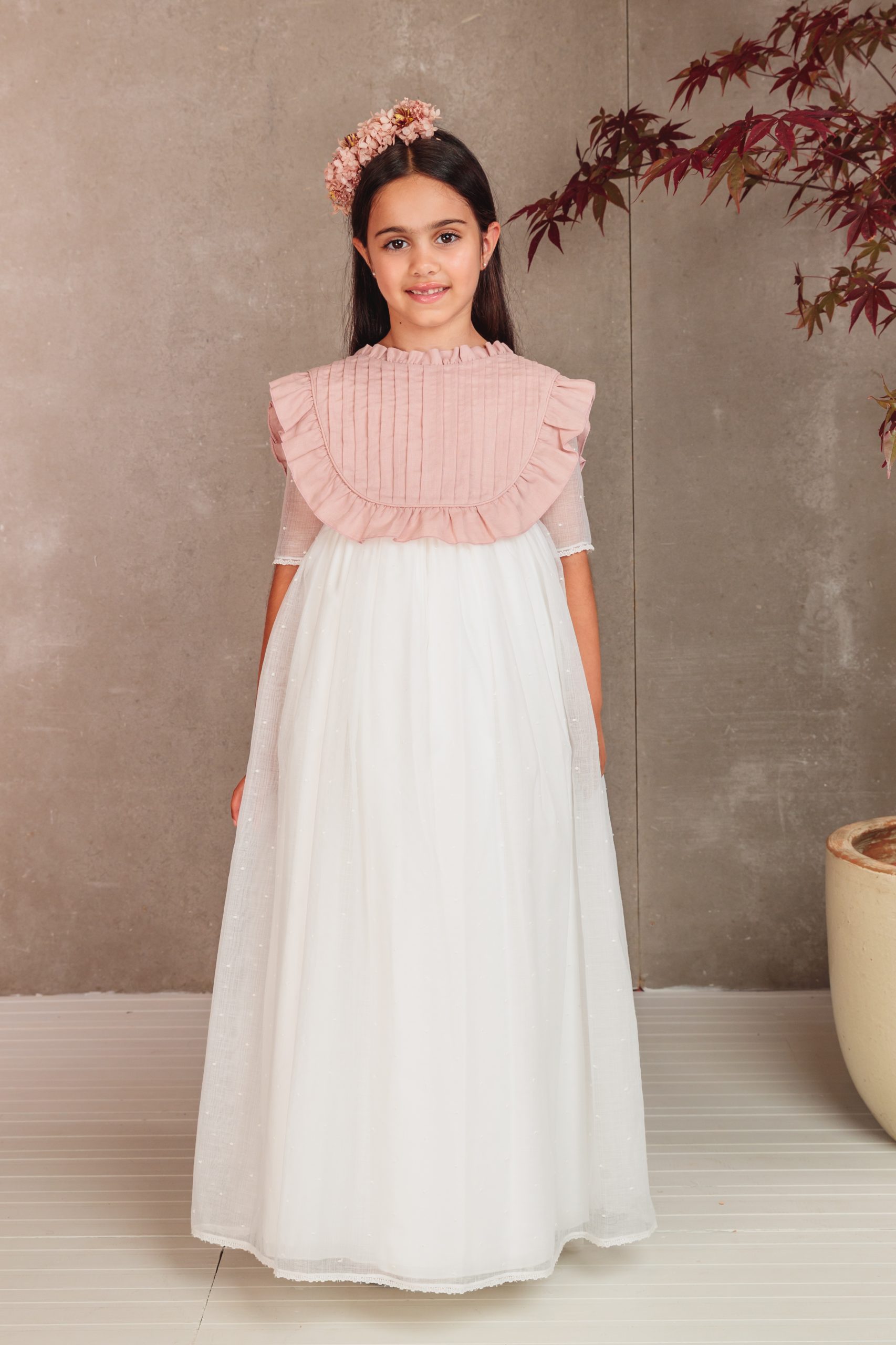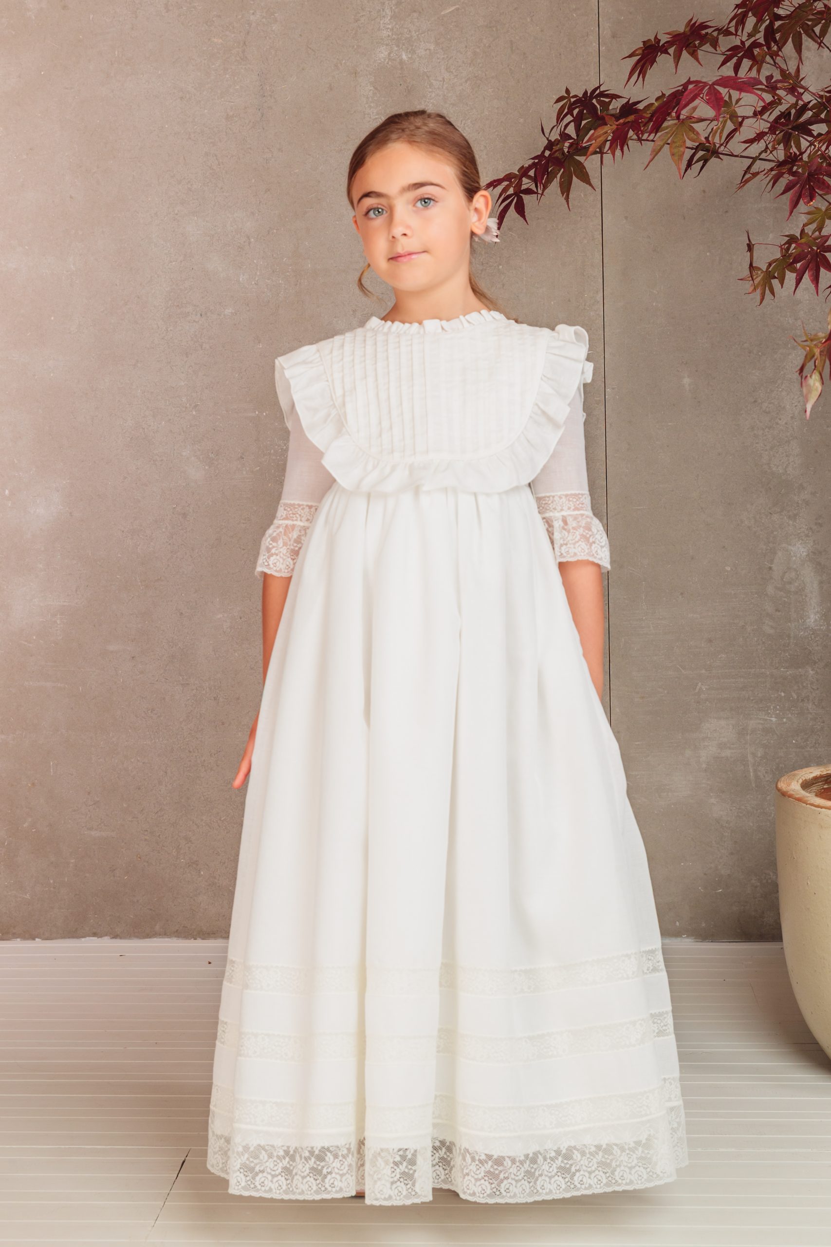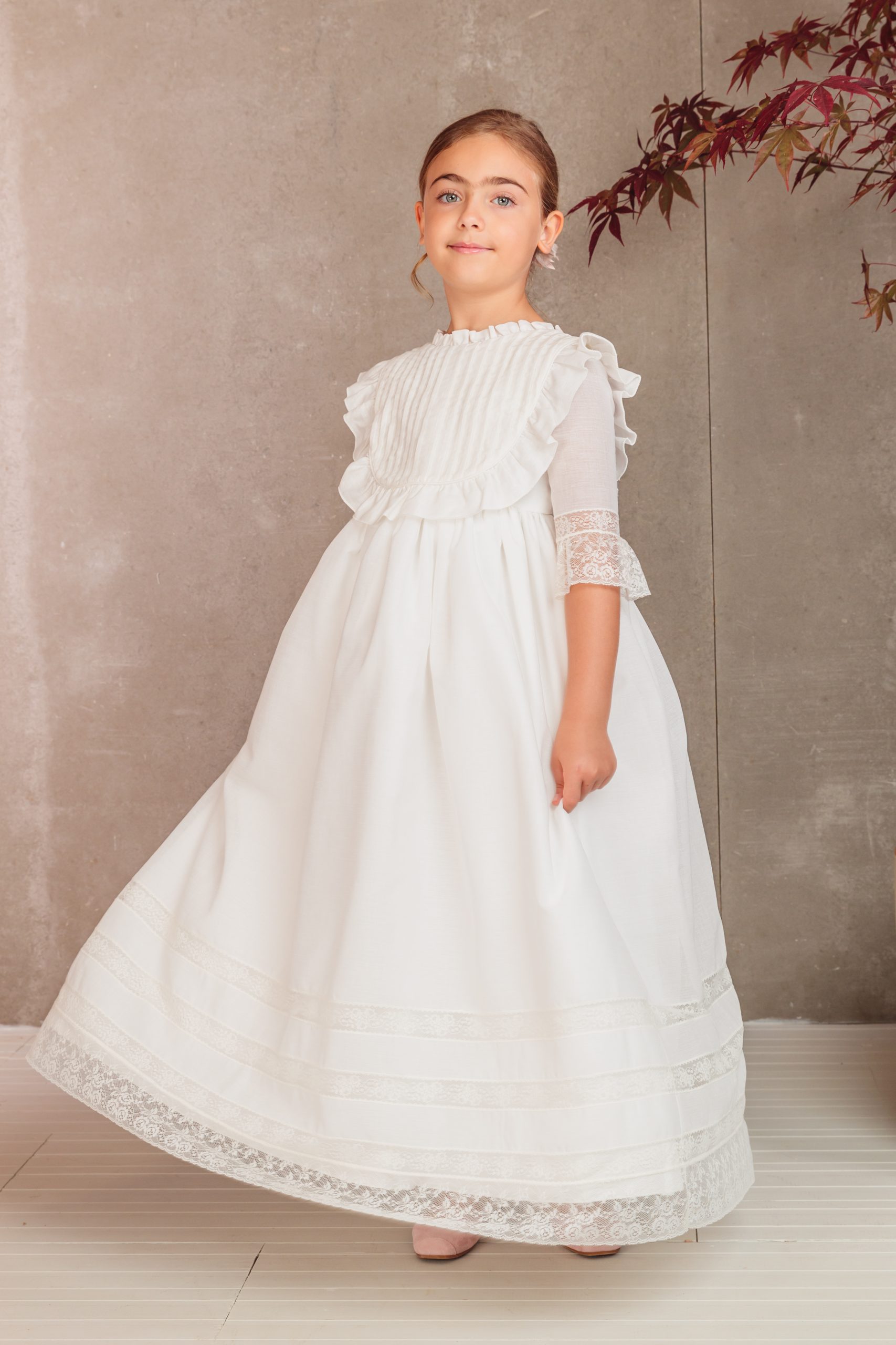 Esta delicada capa de comunión con lino y lorzas en el cuerpo delantero es el complemento perfecto para un look inolvidable.