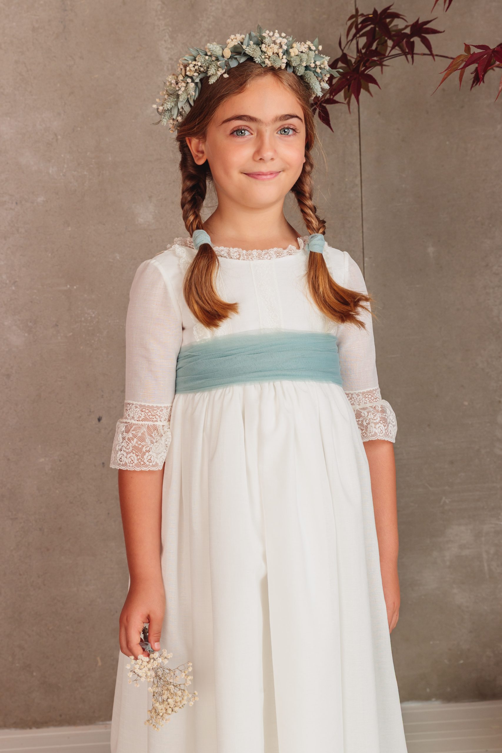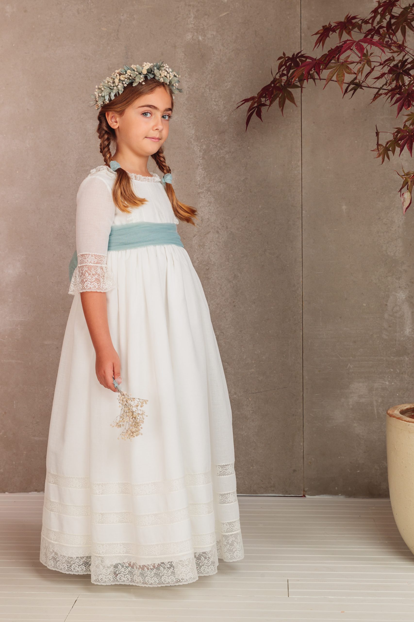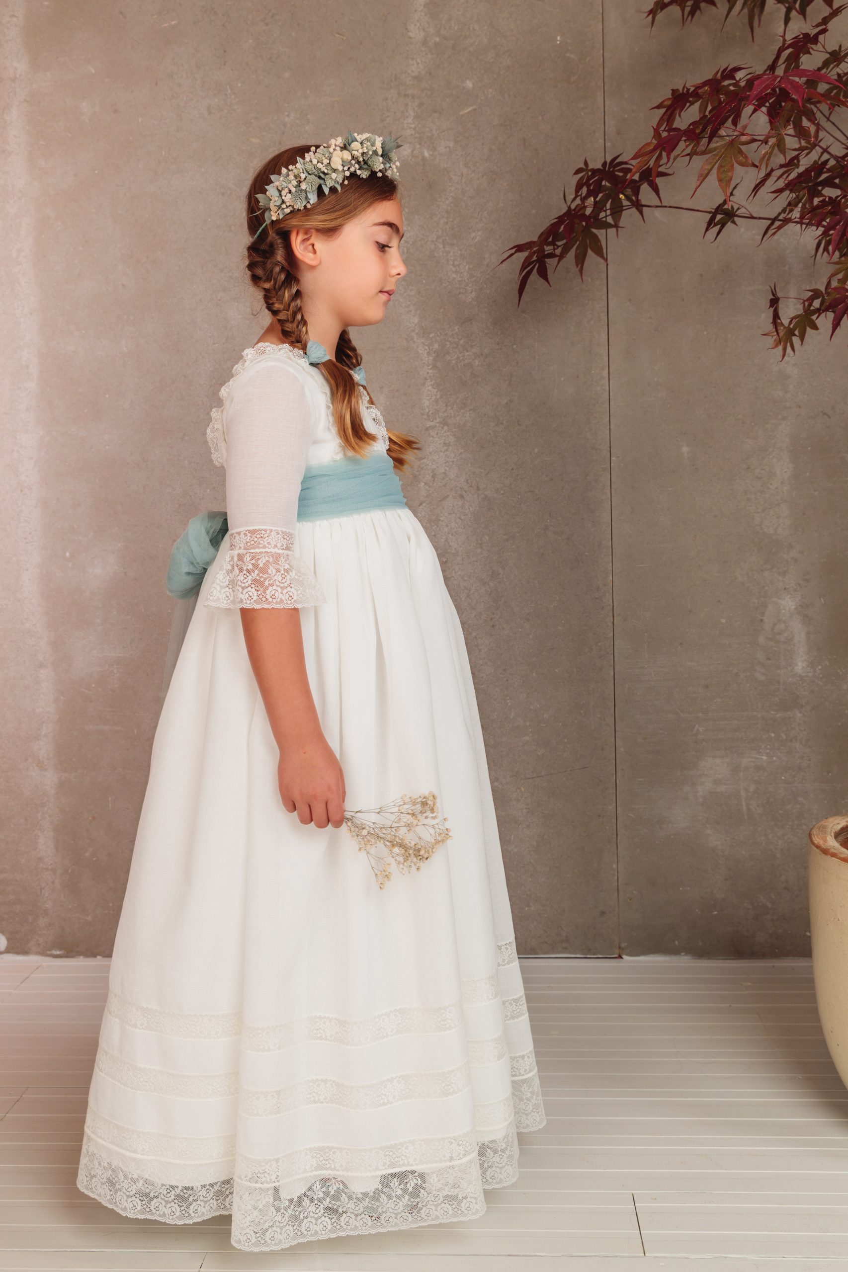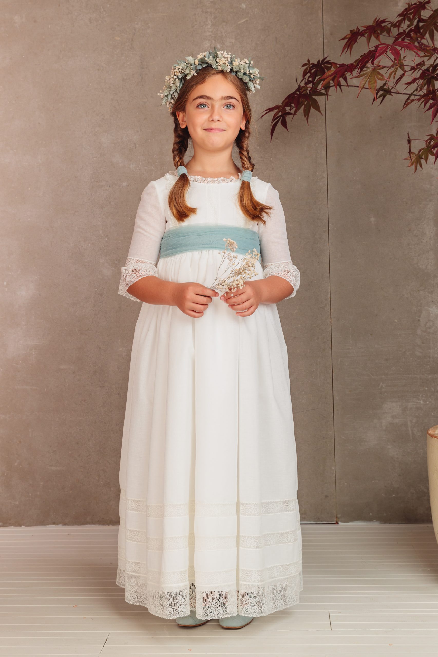 El vestido de comunión Covadonga de Flor de C está confeccionado en un delicado tejido rústico que aporta autenticidad y elegancia al diseño. La falda luce varios entredós con puntilla en el bajo, mientras que el cuerpo y las mangas destacan con combinaciones de puntilla y entredós que realzan su estilo artesanal. La espalda bailarina con botones forrados completa un vestido único, ideal para niñas que buscan un diseño de comunión con encanto tradicional y personalidad.