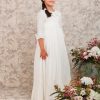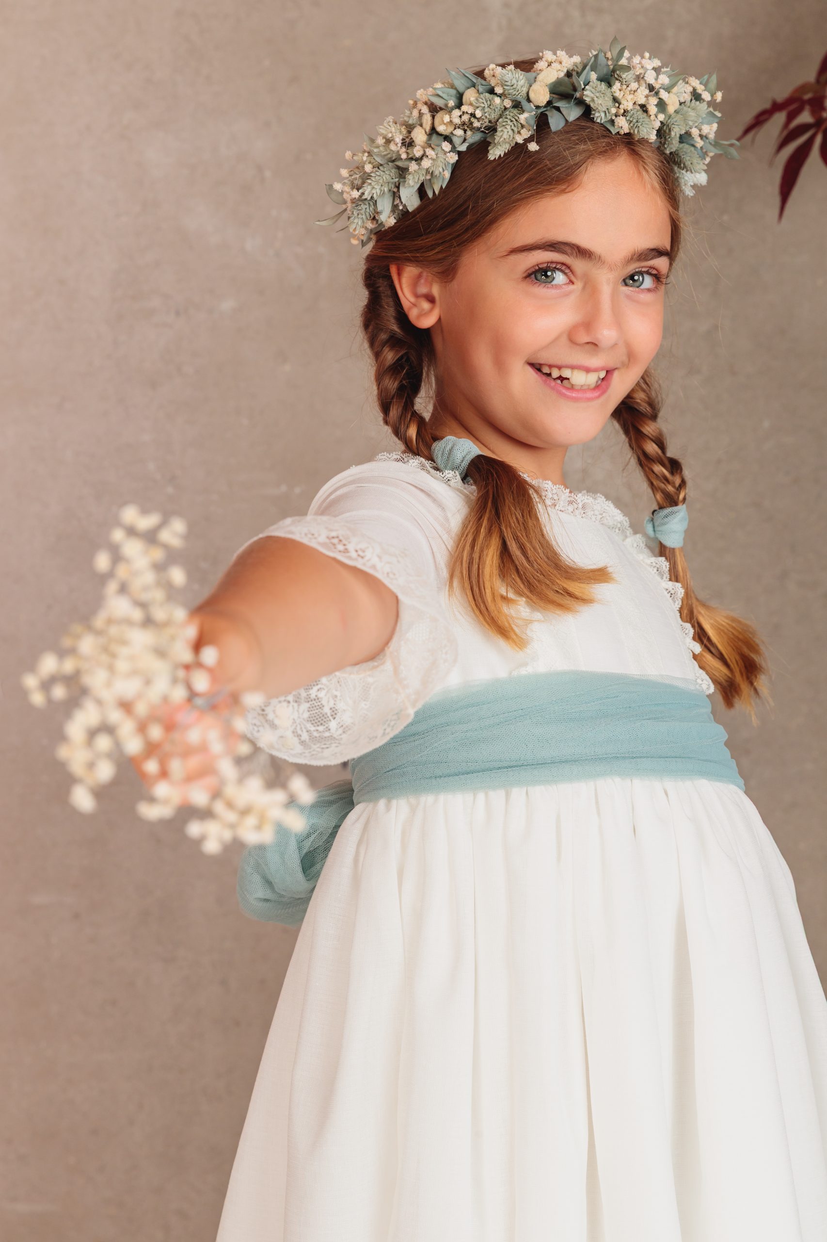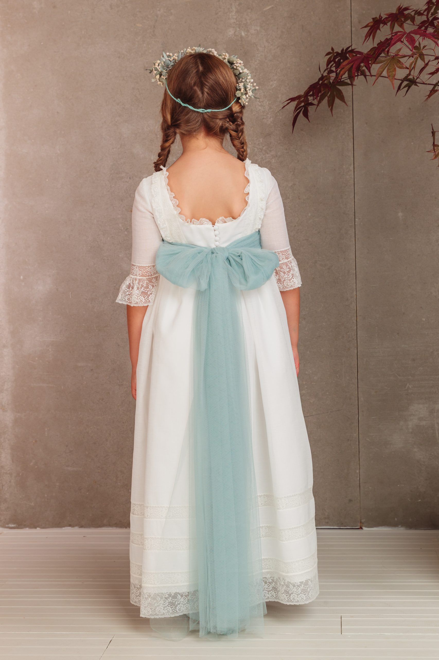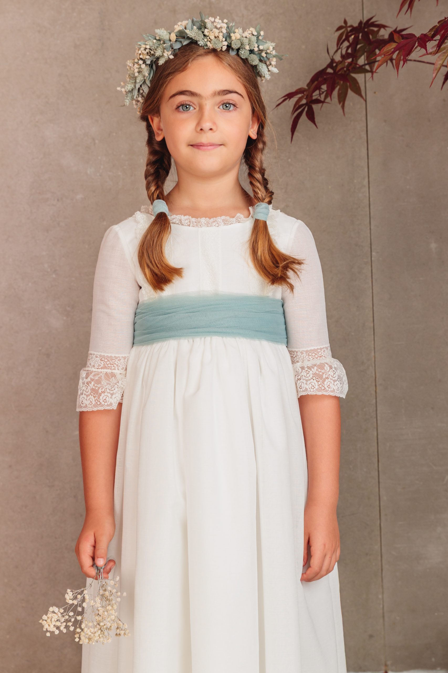 El vestido de comunión Covadonga de Flor de C está confeccionado en un delicado tejido rústico que aporta autenticidad y elegancia al diseño. La falda luce varios entredós con puntilla en el bajo, mientras que el cuerpo y las mangas destacan con combinaciones de puntilla y entredós que realzan su estilo artesanal. La espalda bailarina con botones forrados completa un vestido único, ideal para niñas que buscan un diseño de comunión con encanto tradicional y personalidad.