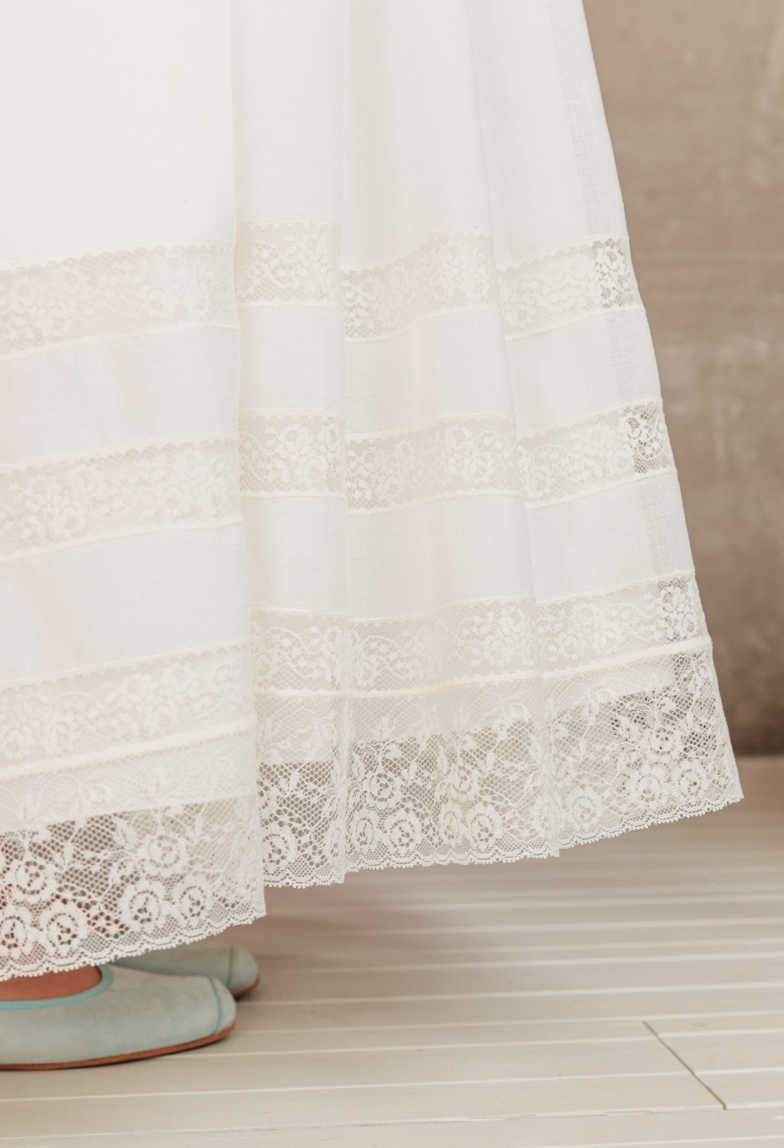 Vestido de comunión Covadonga en tejido rústico con puntillas y entredós, espalda bailarina y botones forrados en el mismo tejido. Totalmente forrado