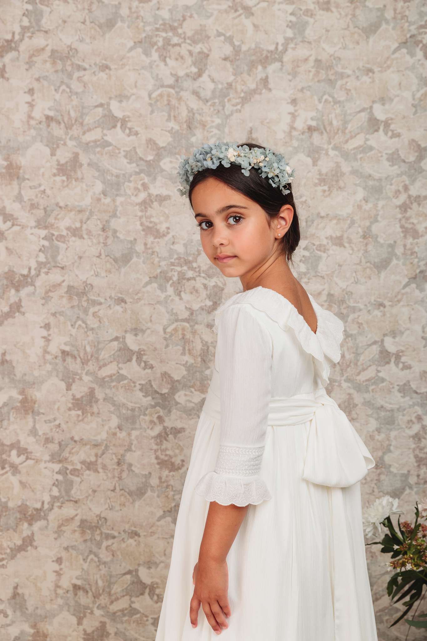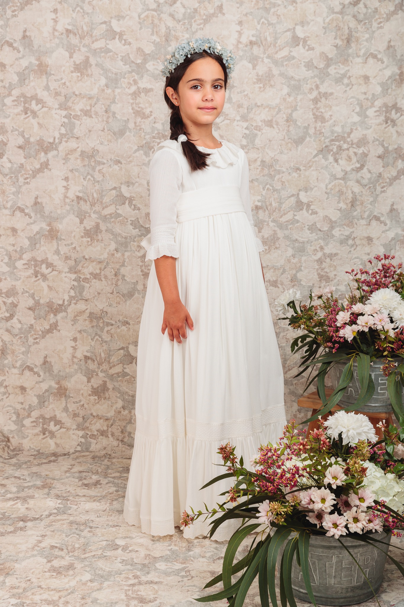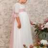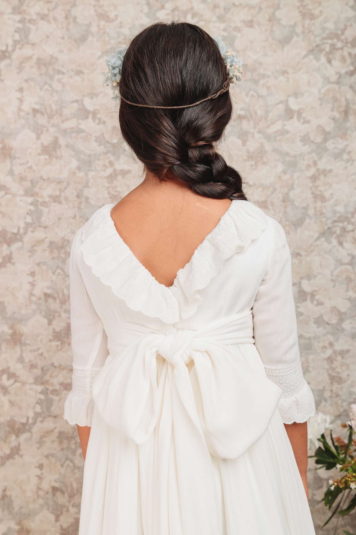 Vestido de comunhão com corpete de tule bordado. Saia fluida em camadas de tule e renda na parte inferior e no decote. Costas de bailarina e botões cobertos. Laço incluído com a possibilidade de o mudares. Totalmente forrado