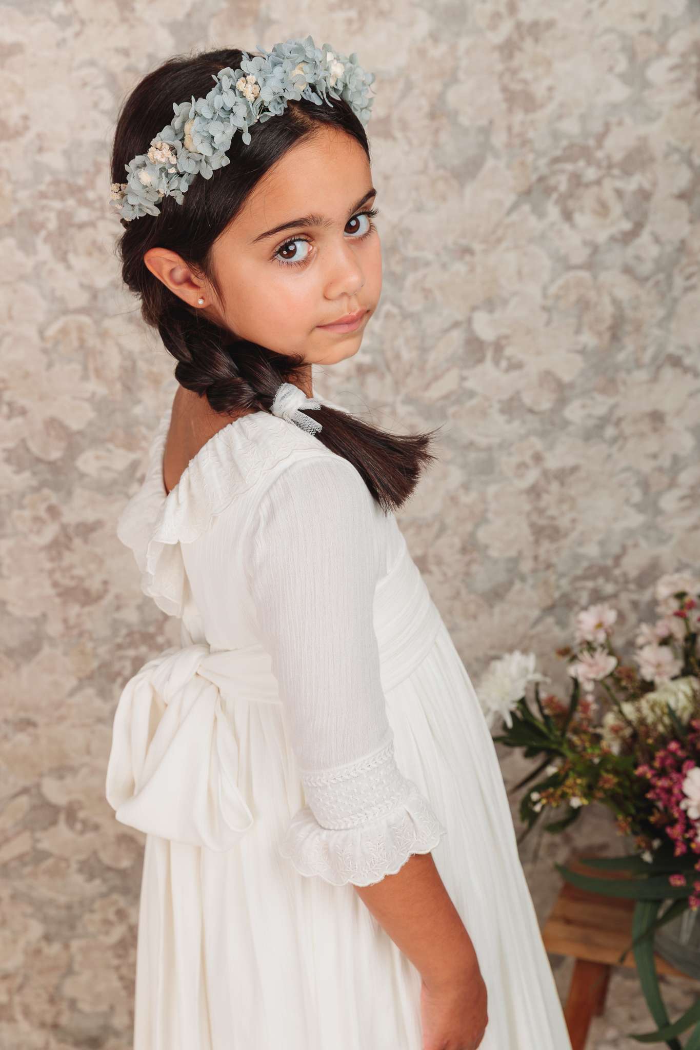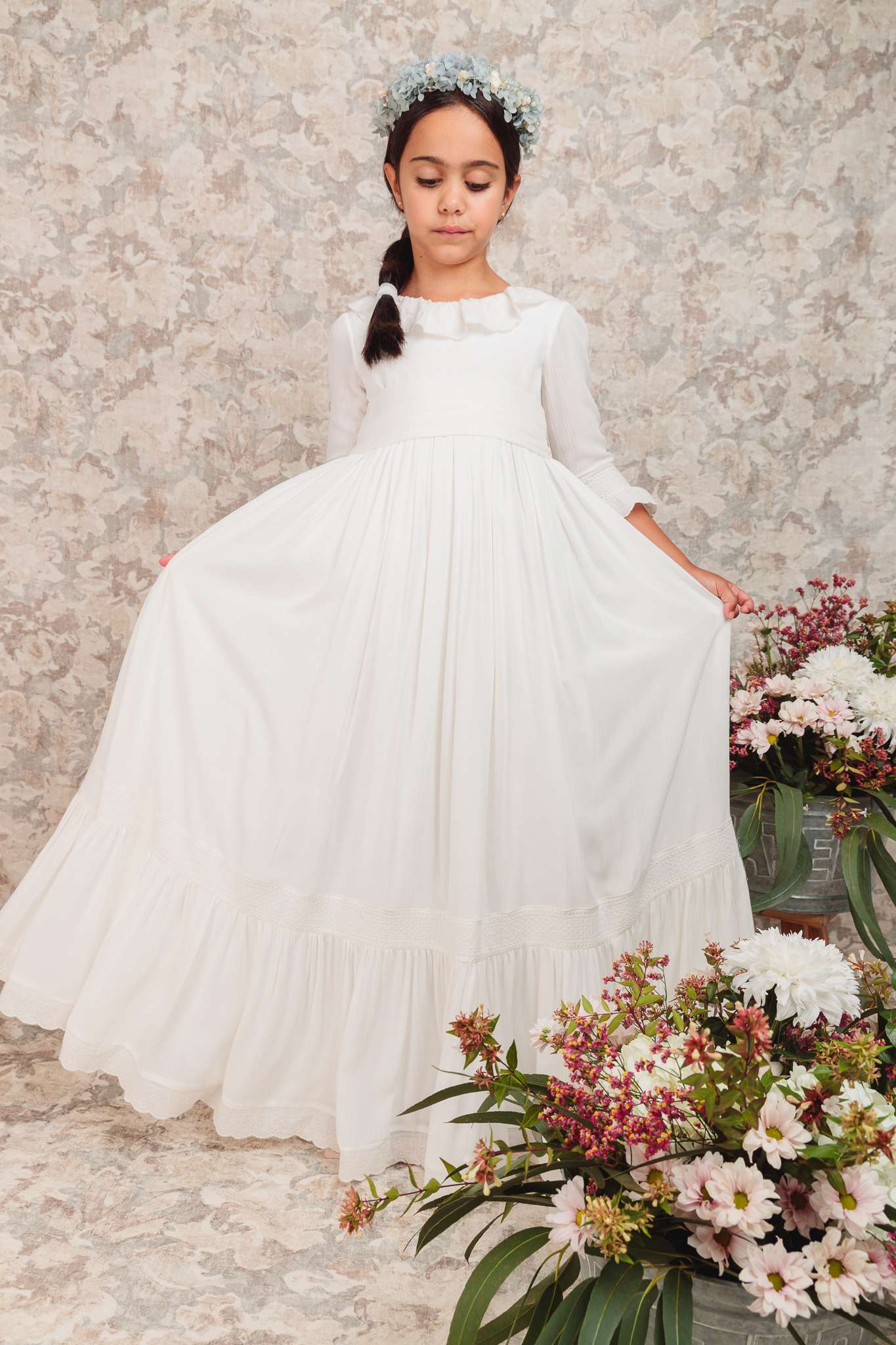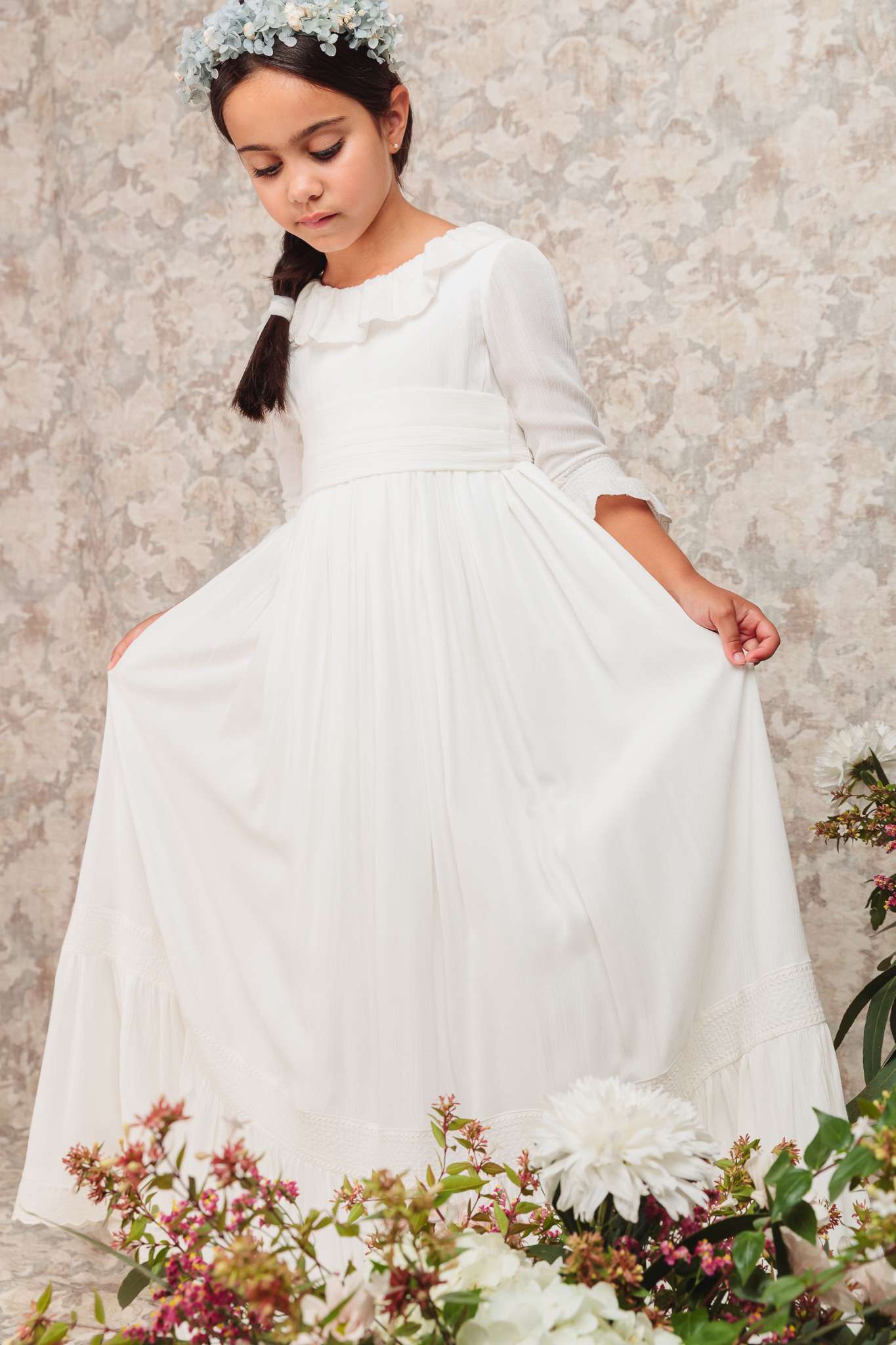 Vestido de comunhão com corpete de tule bordado. Saia fluida em camadas de tule e renda na parte inferior e no decote. Costas de bailarina e botões cobertos. Laço incluído com a possibilidade de o mudares. Totalmente forrado